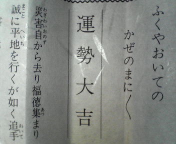 2007年が始まりましたぁ〜(o^o^o)/♪ 今年もヨロシクお願いしますm(__)m みなさんは‘初詣’行きましたか?? ちなみに私は、ご覧の通り“大吉”\(~o~)/ ♪ 今年もこのままの勢いで頑張って行きますッ(^^)v |