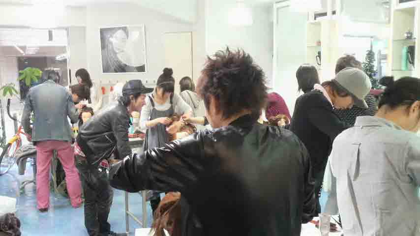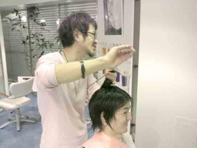 写真は、アシスタントの中西くんをカット中です。中西くんは、ちょっと髪の毛 にクセがあるので、それをいかしてWAXで簡単に動きを出してパーマっぽくみえる ようにカットしてみました